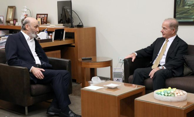 عيسى في معراب: وفي معراب حطّ السفير الاميركي ميشال عيسى اليوم حيث استقبله رئيس حزب القوات اللبنانيّة سمير جعجع ،يرافقه الملحقان السياسيان جسي سافو وجايمي اوماليا، في حضور رئيس جهاز العلاقات الخارجيّة في الحزب الوزير السابق ريشار قيومجيان وعضو الهيئة التنفيذيّة د. جوزف جبيلي. وعرض المجتمعون في الإجتماع الذي استغرق ساعتين من الوقت، للمستجدات السياسيّة على المستويين اللبناني والإقليمي.